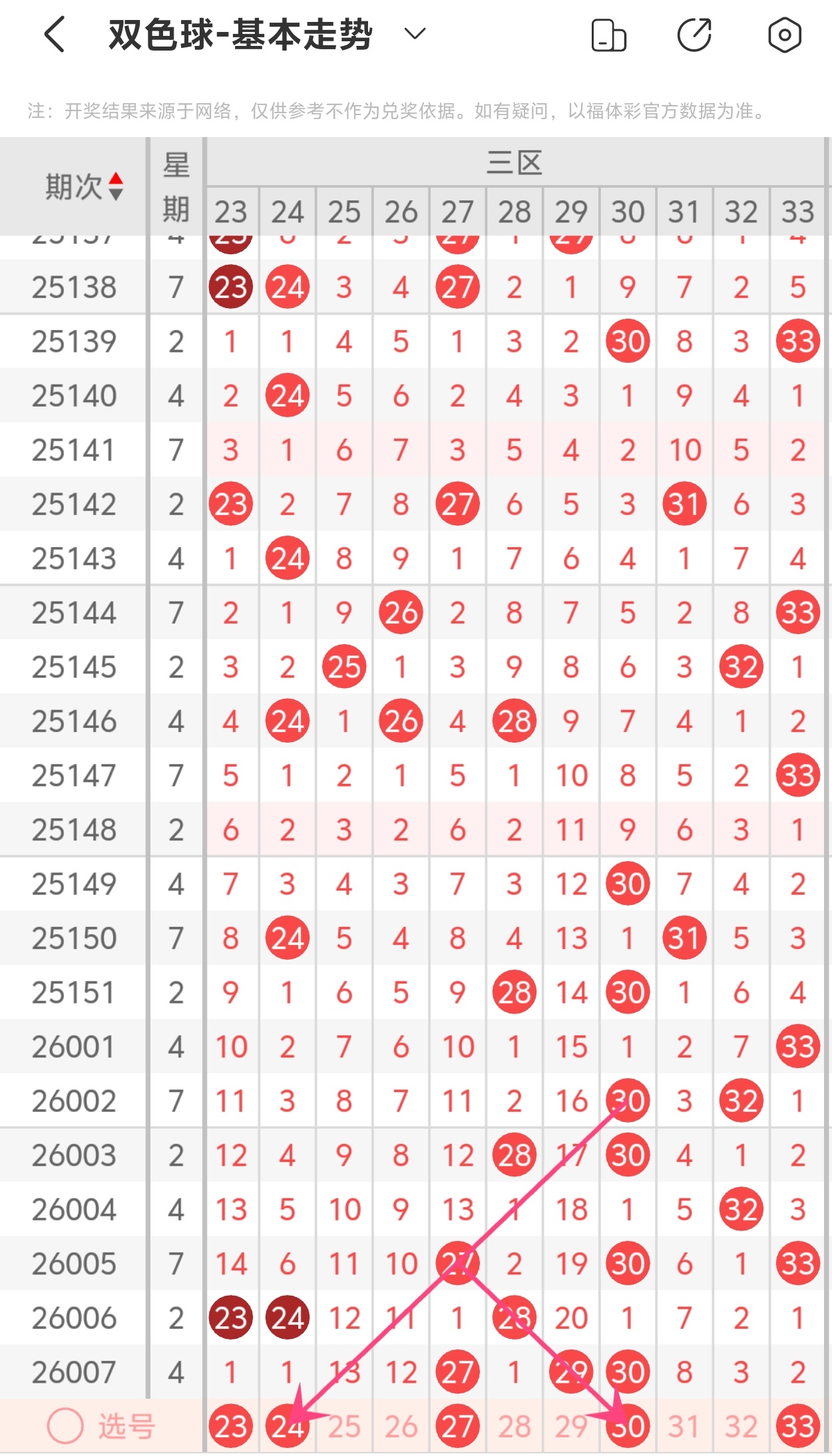 下面双色球的第三区间走势图分析: