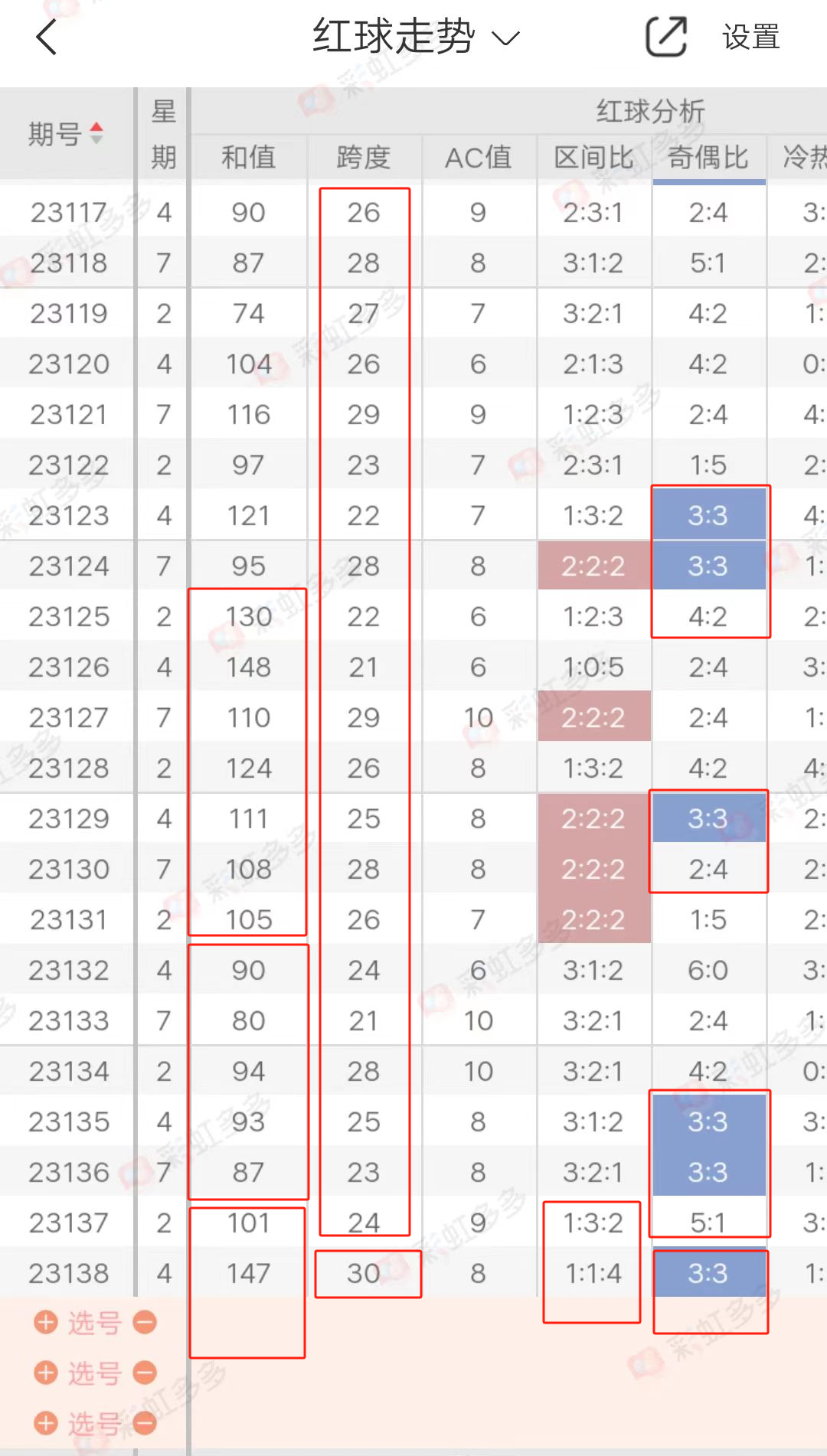 和值走势,上期红球和值为147,本期可以看好和值回落,在110左右。
