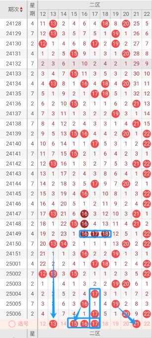 根据走势图可以看出当前区段,148期开出来15.16.21三个号码球,149期开出了16.17.18.22四个号码球,150期开出了13.14.20.22四个号码球,151期开出了16.19二个号码球,001期开出了17.18.22三个号码球,002期开出了12.13.15.22四个号码球,003期开出来19.20二个号码球,004期开出来17一个号码球,005期开出了16.19二个号码球,006期开出了17.20.22三个号码球,按照如此规律本期当前区可能开出1双1单或2单。我们看下当前区上期没有开出重叠号,那么本期当前区要定重叠号的情况下可关注17号码球。再看下当前区上期开出17.20斜连号,当期选号得留意斜连21号码球。本区重点关注15.16.17.21