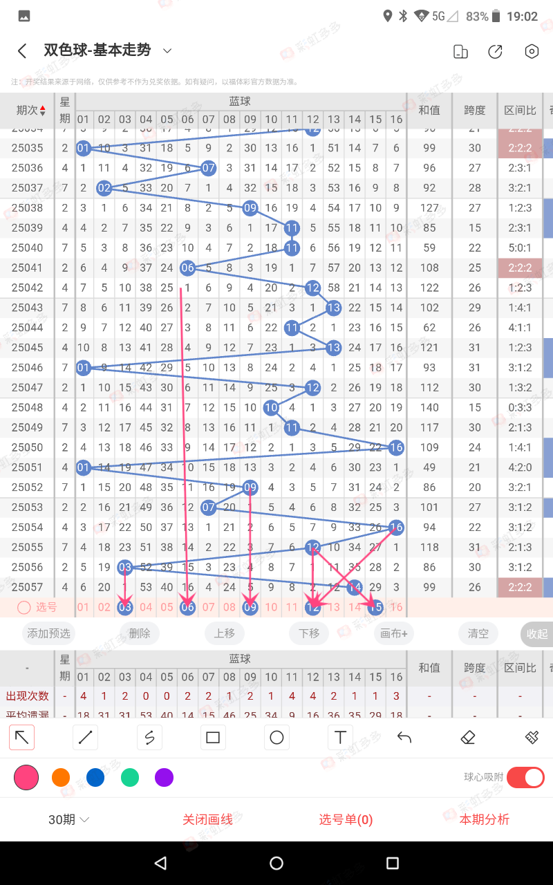 通过以上规律,近期表现为近10年同期,开球多的路数可以不考虑,(024期-043-045-047-052-053开球多的,路数错,)因此057期不看1路蓝色,但本期隔防错