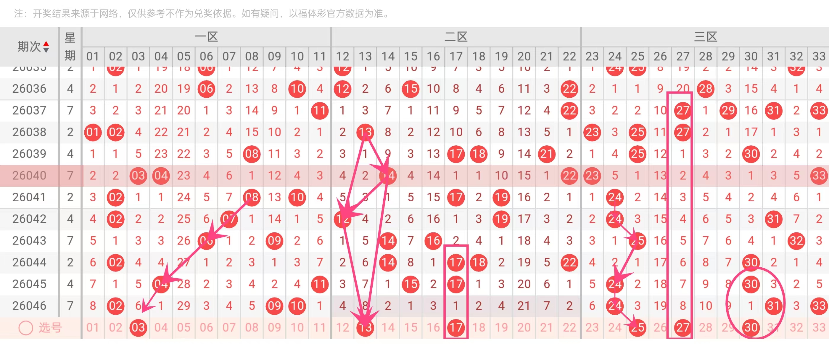 三区开出:24、31、33(共3个)。跟一区似的出这么多号,我分析你凭啥和1区一样,这区间比简单,可能还出3个,具体号码如下