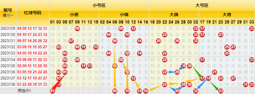【数据参数】依前区大小奇偶属性,组合分成小号(0-16)大号(17-33)区,小号区分成小奇(1、3、5、7、9、11、13、15)和小偶(2、4、6、8、10、12、14、16),大号区分成大偶(18、20、22、24、26、28、30、32)和大奇(17、19、21、23、25、27、29、31、33)。
