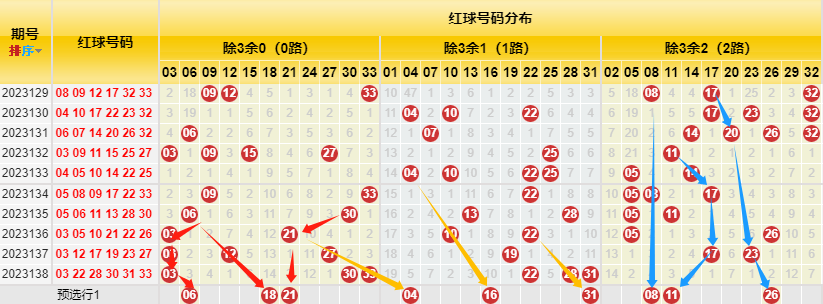 【数据参数】 根据前区除3余数,组合成上图分别为余0路(简称0路)3、6、9、12、15、18、21、24、27、30、33;余1路(简称1路)1、4、7、10、13、16、19、22、25、28、31; 余2路(简称2路)2、5、8、11、14、17、20、23、26、29、32。