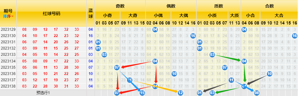 【数据参数】 根据前区质合小大属性,组合成上图质数区1、2、3、5、7、11、13、17、19、23、29、31和合数区4、6、8、9、10、12、14、15、16、18、20、21、22、24、25、26、27、28、30、32、33,质数区分为质数左区1、2、3、5、7、11和质数右区13、17、19、23、29、31;合数区分为合数左区4、6、8、9、10、12、14、15、16、18)和合数右区20、21、22、24、25、26、27、28、30、32、33。
