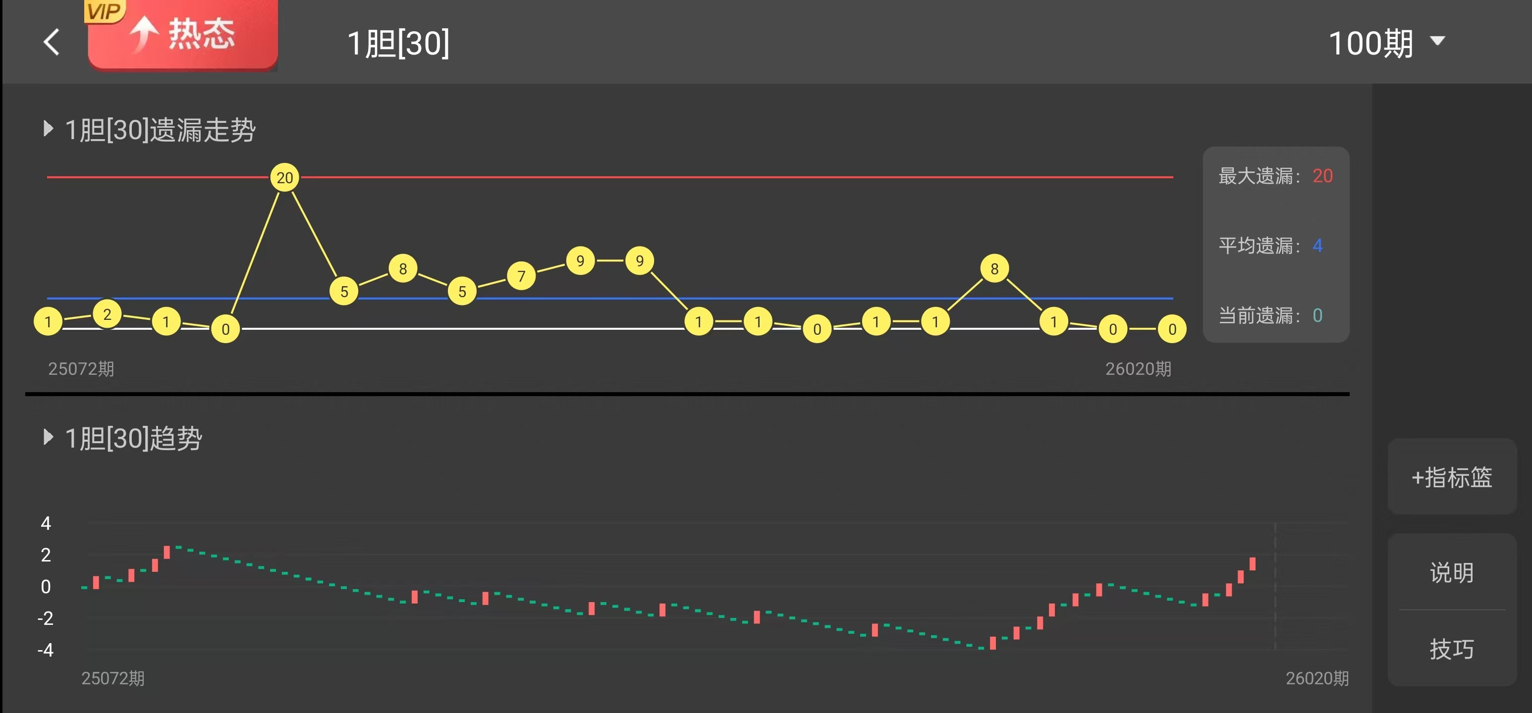 杀红球 33:凤尾走势。观察近期凤尾(最大号),分别为31、30、30、32、30、30,主要集中在30-32之间。33作为最大号,在近期走势中并未表现出强势,且容易将和值推得过高,不符合近期主流。