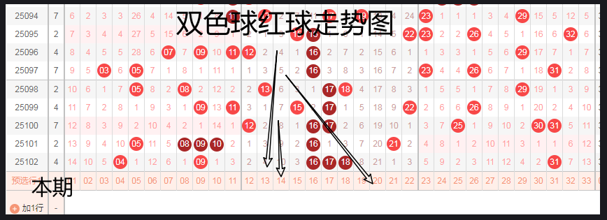 一、本期红球定胆分析;102 期开奖号码:04、09、16、17、18、31; 根据规则计算;本期初步胆码为:13、14、20;