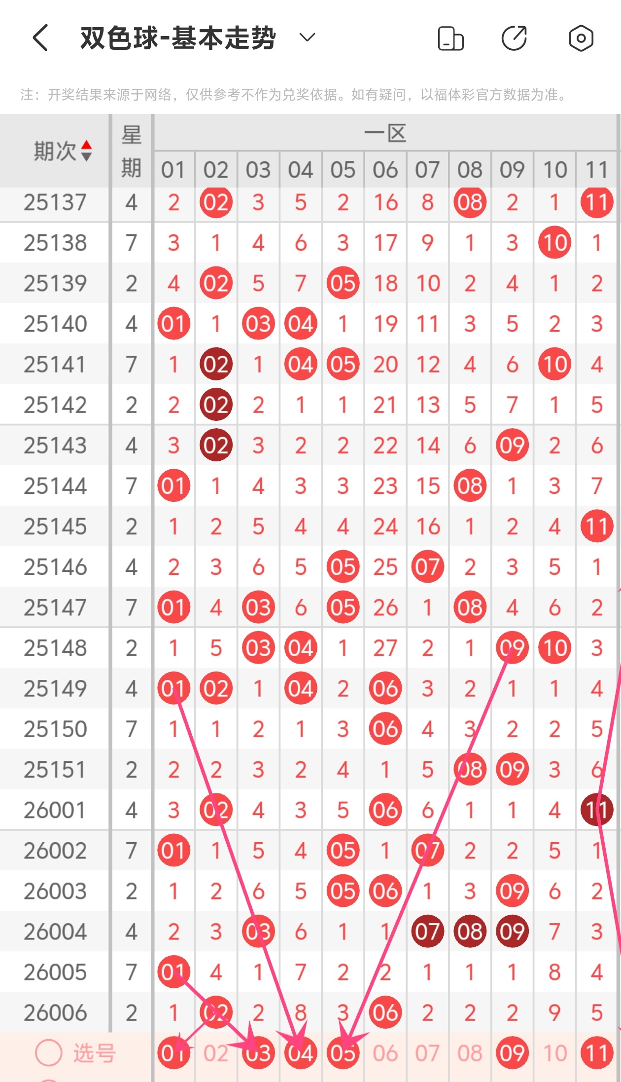 下面双色球的第一区间走势图分析: