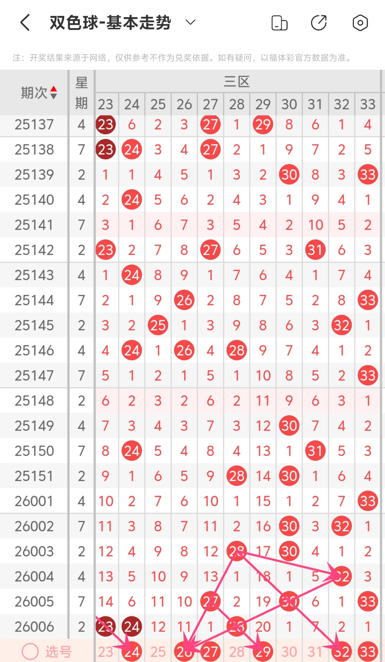 下面双色球的第三区间走势图分析: