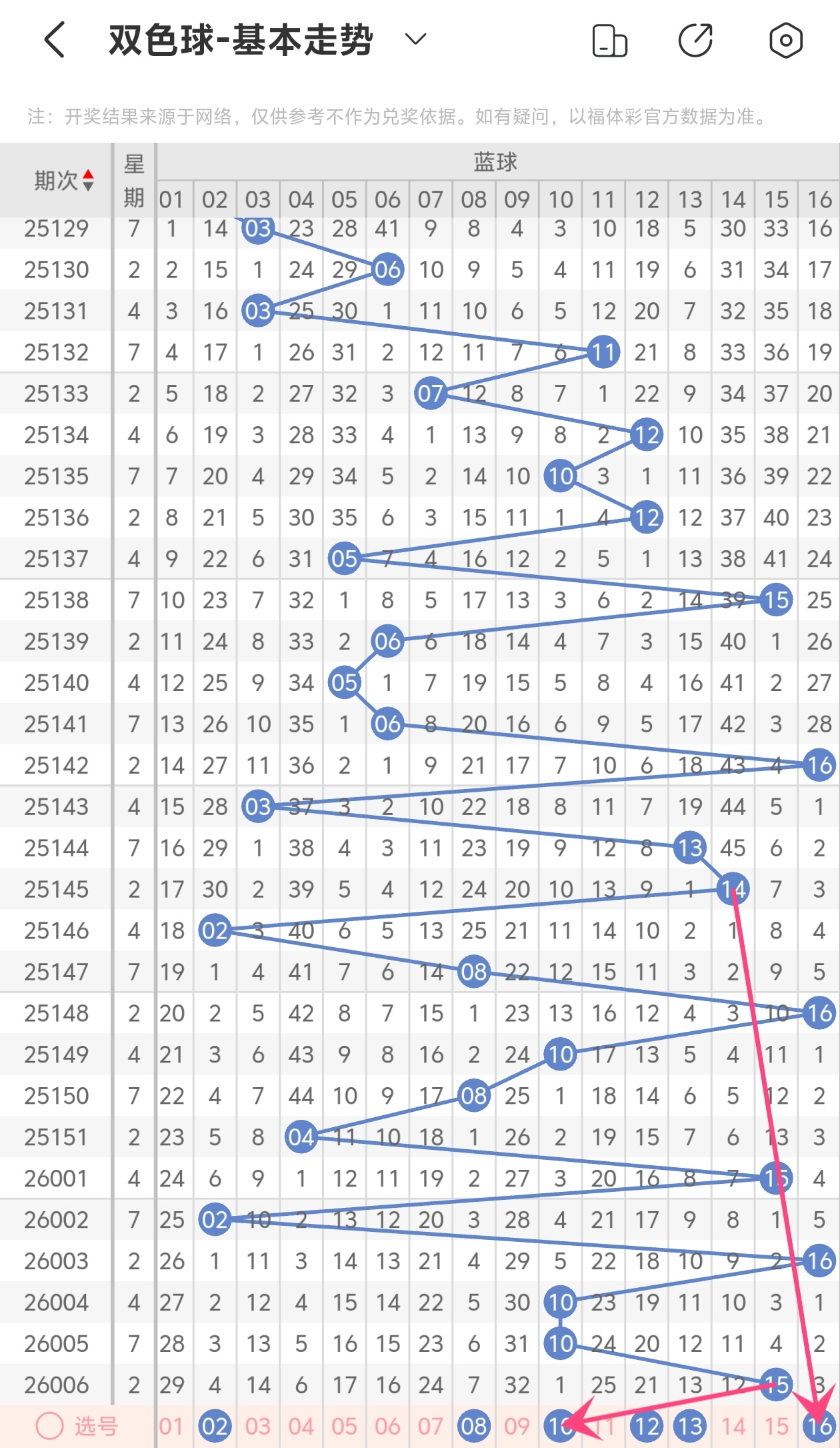 上期蓝球开出16,本期我们可以从上面走势图中看到选号的思路,04为斜连走势,10隔期回补走势,13为斜连走势,综合以上分析本期蓝球推荐01 04 08 10 13