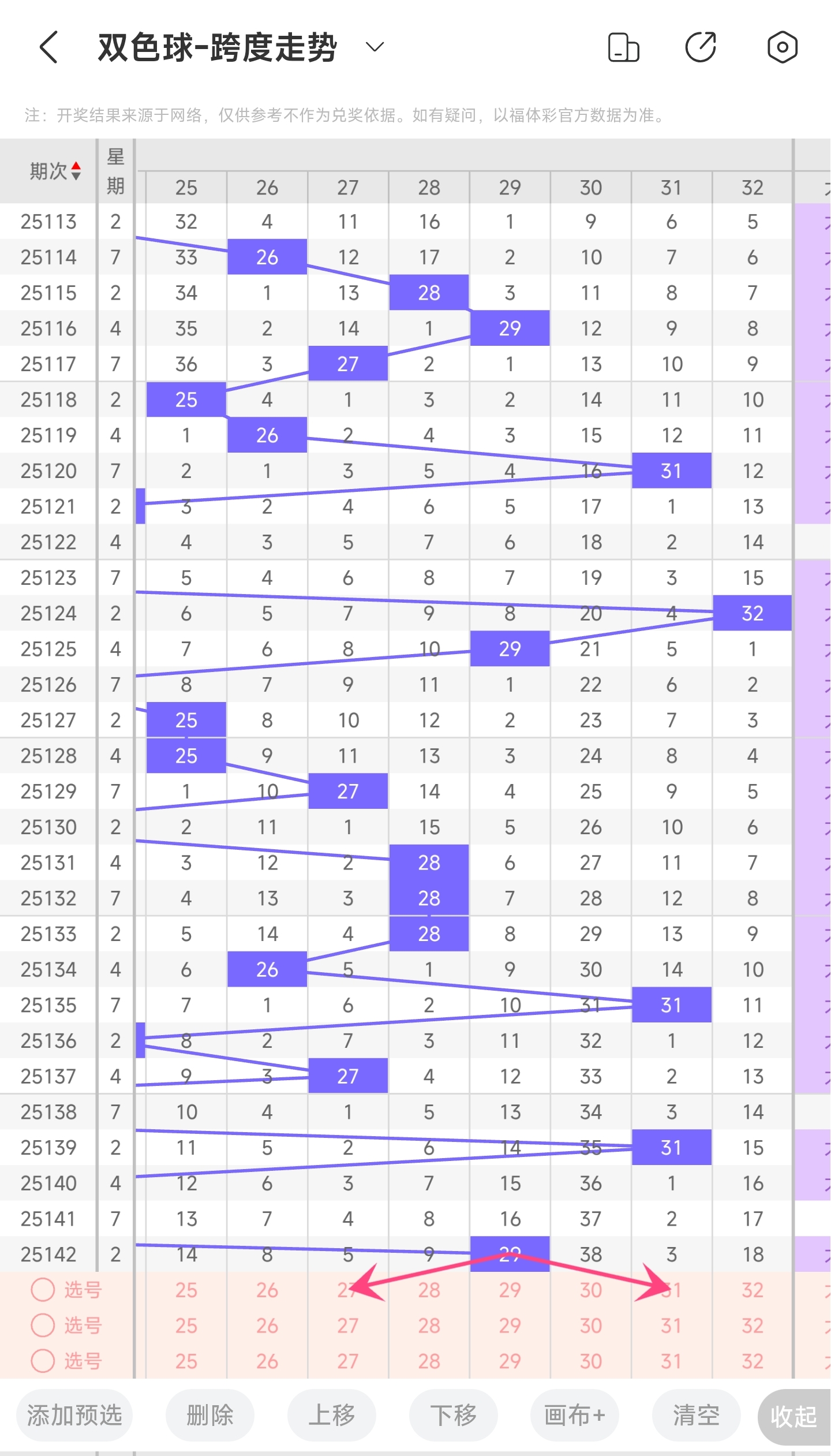 上期龙头为2,凤尾为31,跨度为29,往前一期跨度是11,偏移量为1829跨度值是30期内开出的比较大跨度值。下降的空间比较大,上升的空间很小,但本期跨度值依然有可能小幅度变大,所以推测本期跨度趋势是往右的,跨度变大。