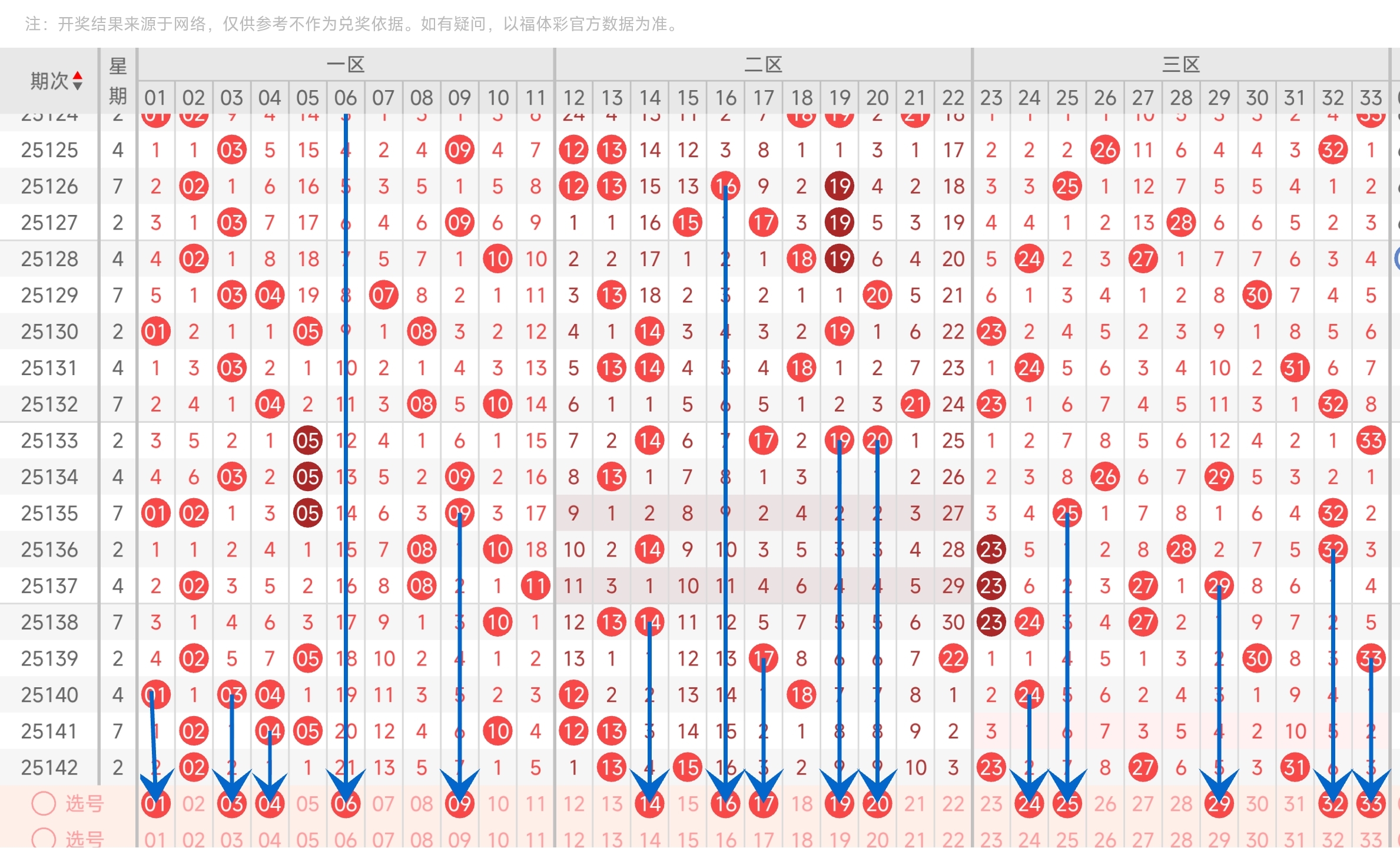 上一期三区开出了232731号球。往前一期没有开出号码。通过走势图分析,可以看到上期开了3个号码,开的比较均匀,推测本期号码大概率会有所减少。本期凤尾还是看好在右边的位置开出,其次有可能回补中间。除开凤尾的其它号码,本期我们也是均匀关注一下左中右的号码。最后再结合冷热号和遗漏期数,本期我们可以关注2425293233等号。综上所述本期我们推测有可能开出2425293233等号码。