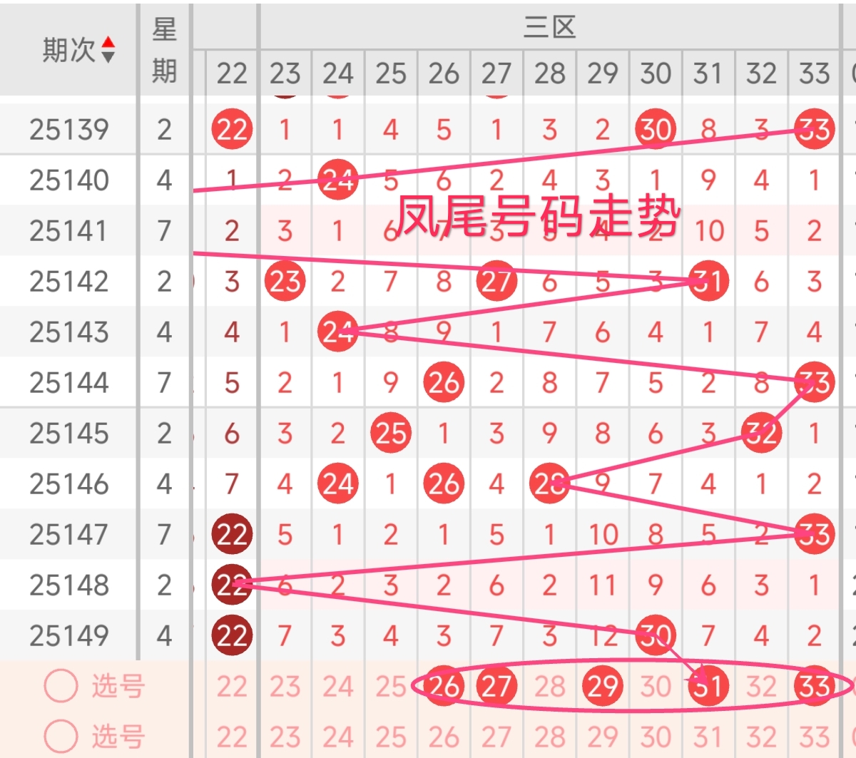 红球三区推荐(23~33): 上期开出1枚号码,号码为30,本期红三区建议出号1-3枚,本期红三区建议出关注号26、27、29、31、33。