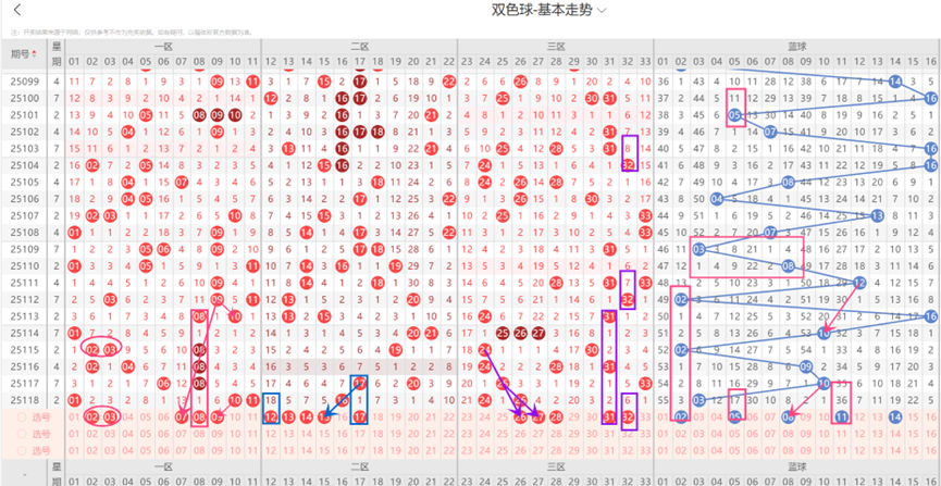 上一期三区开出了2个号码;本期三区大概率不会断区,本期三区出号数量可以考虑2个,防3个;本期三区需要关注的号码:26可能会重出;27与25-26形成了斜连走势;27-28可能会同时落号;31为当前三区出号热点号码;32遗漏值8-7-6容易出号;因此本期三区选号应该考虑26-27-28-31-32等号码。