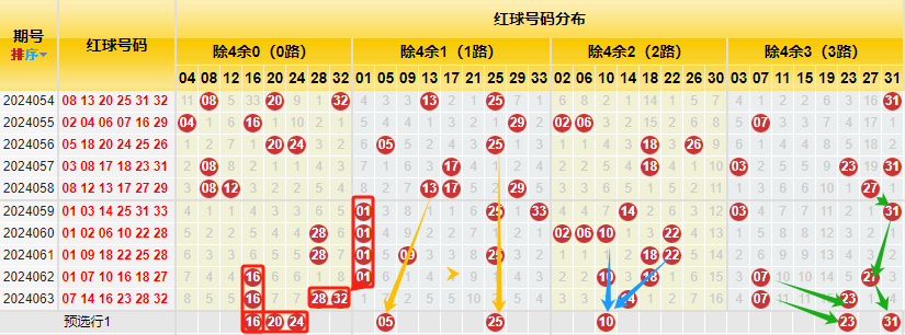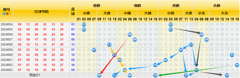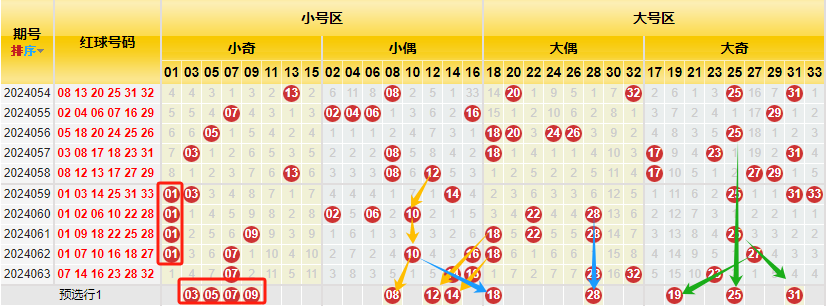 1、小大奇偶交叉图(小奇数红色箭标、小偶数黄色箭标、大偶数蓝色箭标、大奇数绿色箭标)