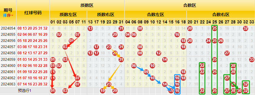 【数据参数】 根据前区质合小大属性,组合成上图质数区1、2、3、5、7、11、13、17、19、23、29、31和合数区4、6、8、9、10、12、14、15、16、18、20、21、22、24、25、26、27、28、30、32、33,质数区分为质数左区1、2、3、5、7、11和质数右区13、17、19、23、29、31;合数区分为合数左区4、6、8、9、10、12、14、15、16、18)和合数右区20、21、22、24、25、26、27、28、30、32、33。