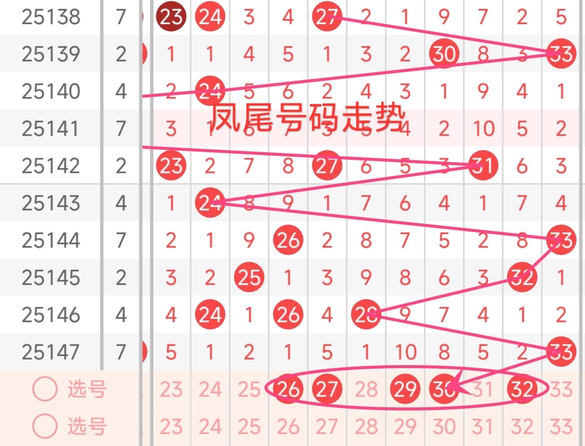 红球三区推荐(23~33):  上期开出1枚号码,号码为33,本期红三区建议出号1-3枚,本期红三区建议出关注号26、27、29、30、32。