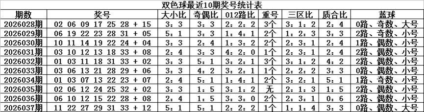 双色球第2026037期开出奖号为:11、22、27、29、31、33+12,其中红球号码奇偶比为5:1,大小比为5:1,012路比为2:2:2,和值为153,跨度为22,三区比为1:1:4,开出1个重复红球:22。蓝球开出偶数、大号、0路。