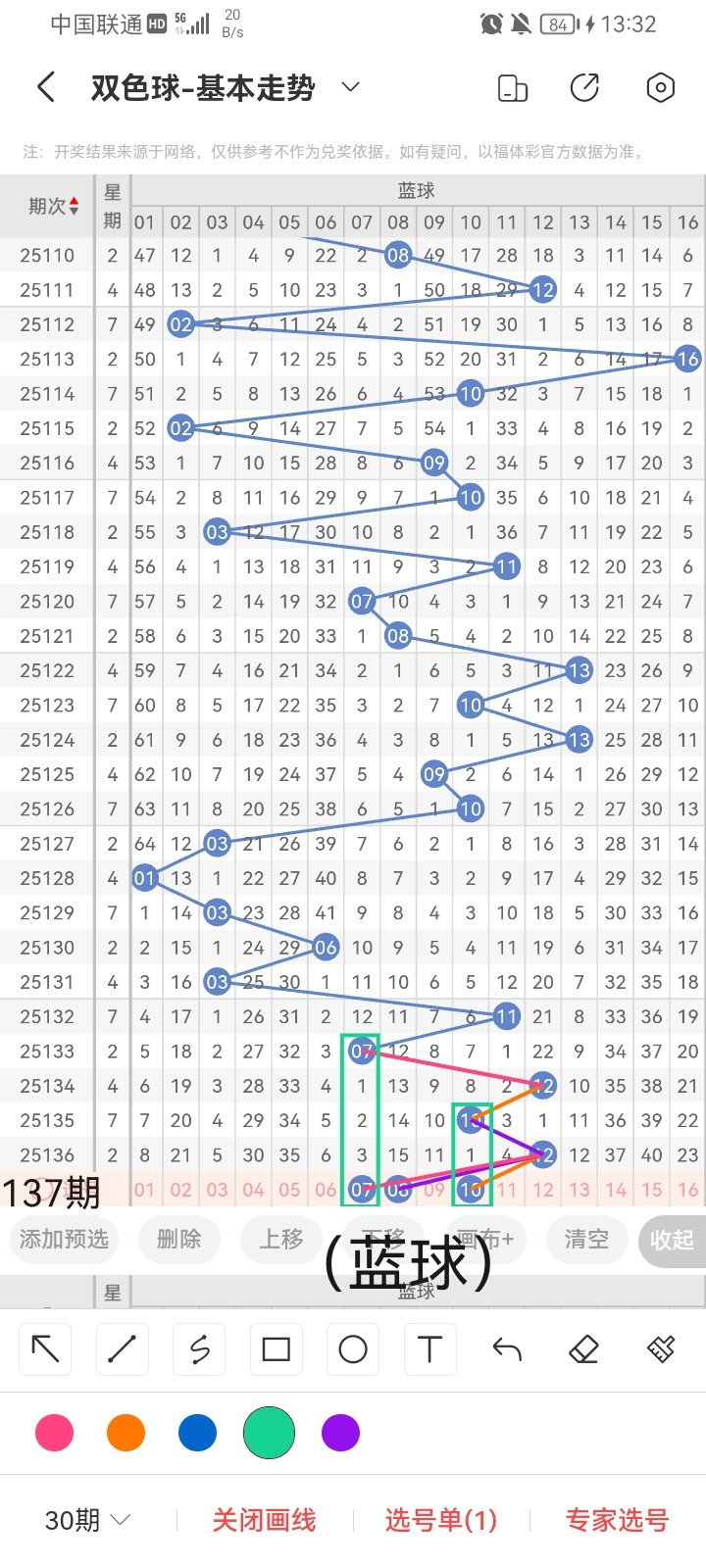 小梁根据图中画线思路,最后给大家汇总提供一下本期红球、蓝球数据,供大家参考:
