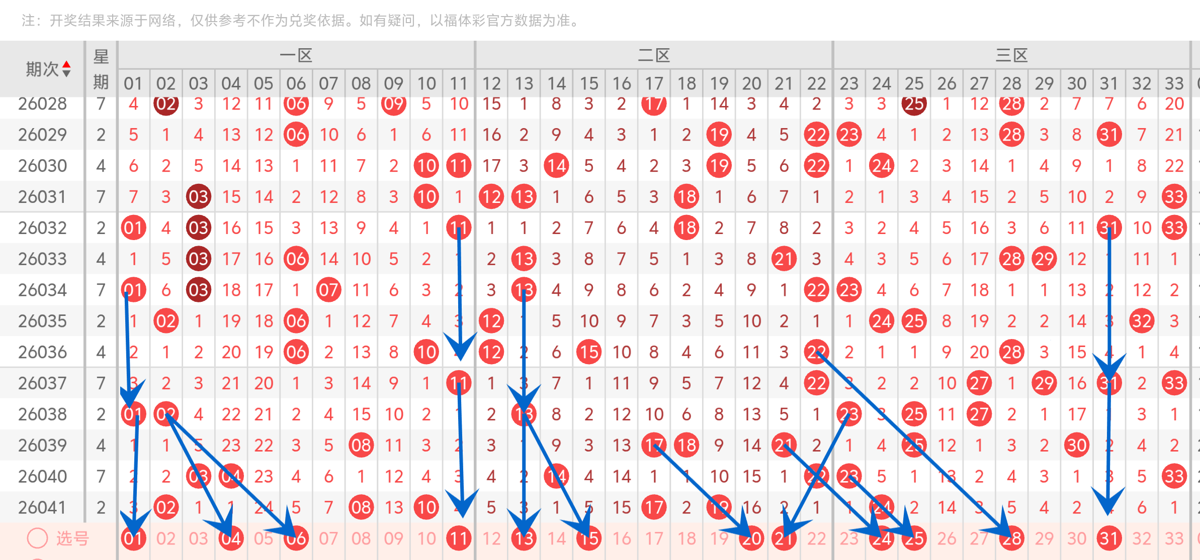 前区红球推荐:01、04、06、11、13、15、20、21、24、25、28、31。