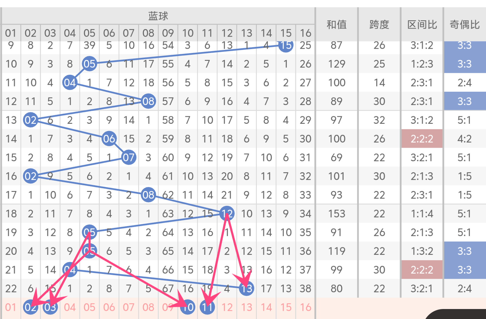 近6期蓝球号码开出04、05、08、12、13号码,通过走势图及奇偶分析,本期推荐关注02、03、10、11等号码。