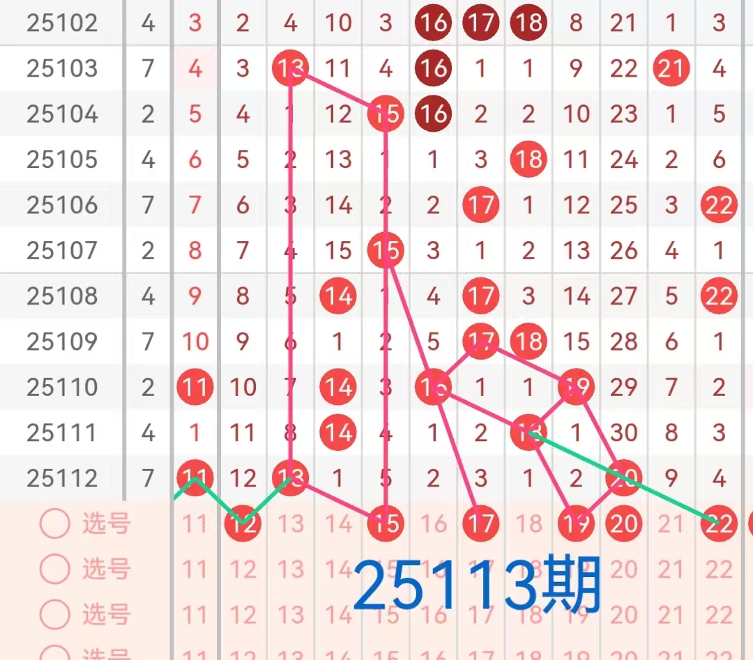 2. 第二区间(12-22):此区间在上期开出两个号码13和20。号码13遗漏8期后开出,且与前期号码14形成斜连走势,号码20在遗漏30期后终于开出。从历史数据来看,该区间内的号码近期出现频率较高,预计本区间会有号码继续开出,博士认为该区可能出1-2个号码。号码12、20近期遗漏次数较大,本期有望回补开出。号码15、17、19、22这几个号码在画线上面有较好的走势。因此本期可关注号码12、15、17、19、20、22