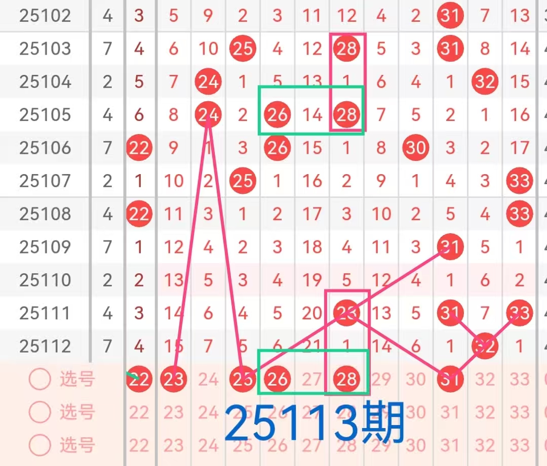 3. 第三区间(23-33):此区间在上期开出一个号码32。号码32为该期的凤尾号码,在遗漏7期后再一次开出,这是个大的凤尾号,本期预计凤尾号码会由此减小。本期考虑凤尾号码仍然会在第三区间产生,尤其是那些遗漏次数较大的号码,如号码26、26。根据历史开奖来看,最近该区间近期活跃度较低,本期考虑该区号码会有1-2号码回补开出。因此本区间关注号码23、25、26、28、31
