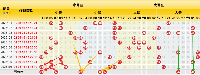 1、小大奇偶交叉图(小奇数红色箭标、小偶数黄色箭标、大偶数蓝色箭标大奇数绿色箭标