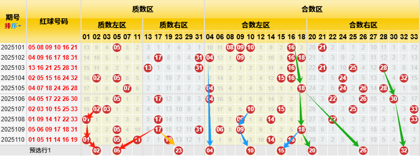 【数据参数】 根据前区质合小大属性,组合成上图质数区1、2、3、5、7、11、13、17、19、23、29、31和合数区4、6、8、9、10、12、14、15、16、18、20、21、22、24、25、26、27、28、30、32、33,质数区分为质数左区1、2、3、5、7、11和质数右区13、17、19、23、29、31;合数区分为合数左区4、6、8、9、10、12、14、15、16、18)和合数右区20、21、22、24、25、26、27、28、30、32、33。