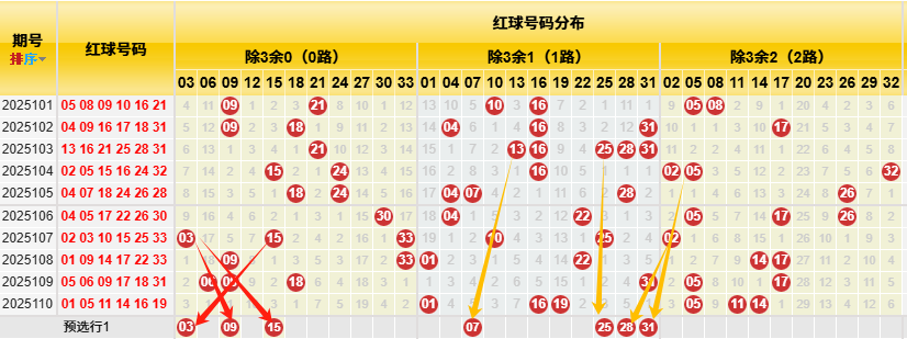 【数据参数】 根据前区除3余数,组合成上图分别为余0路(简称0路)3、6、9、12、15、18、21、24、27、30、33;余1路(简称1路)1、4、7、10、13、16、19、22、25、28、31; 余2路(简称2路)2、5、8、11、14、17、20、23、26、29、32。