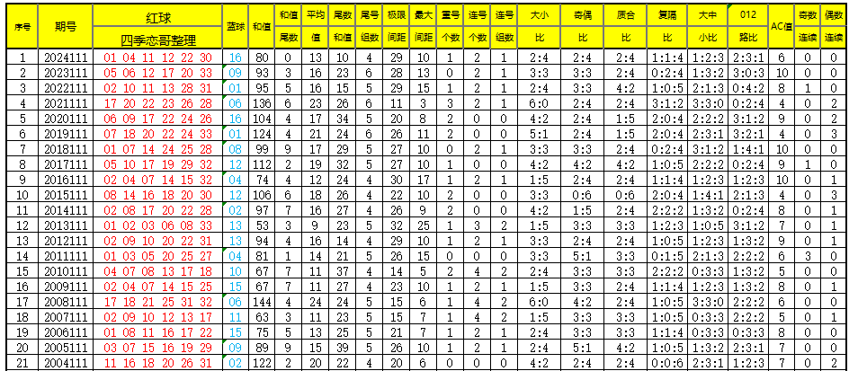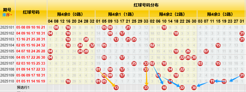 【数据参数】根据前区除4余数,组合成上图分别为余0路(简称0路)4、8、12、16、20、24、28、32);余1路(简称1路)1、5、9、13、17、21、25、29、33;余2路(简称2路)2、6、10、14、18、22、26、30;余3路(简称3路)3、7、11、15、19、23、27、31。