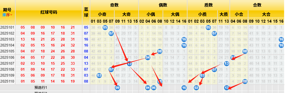 根据蓝球近十期数据统计:小奇数出现4次,大奇数出现1次,小偶数出现3次,大偶数出现2次,小质数出现4次,大质数出现1次,小合数出现2次,大合数出现2次。从上述数据可以看出看出偶数开始回补,要注意偶数咯;再来看历史数据统计,小奇数出现850次,大奇数出现851次,小偶数出现804次,大偶数出现750次,小质数出现818次,大质数出现413次,小合数出现609次,大合数出现888次,从上述数据可以看出小奇数、大偶数、小质数、小合数历史数据占优,结合近十期数据对比,因此短期内关注合数和奇数持续大热,故本期结合上述数据并根据斜率对称原理看好09 04 06 16 02 13