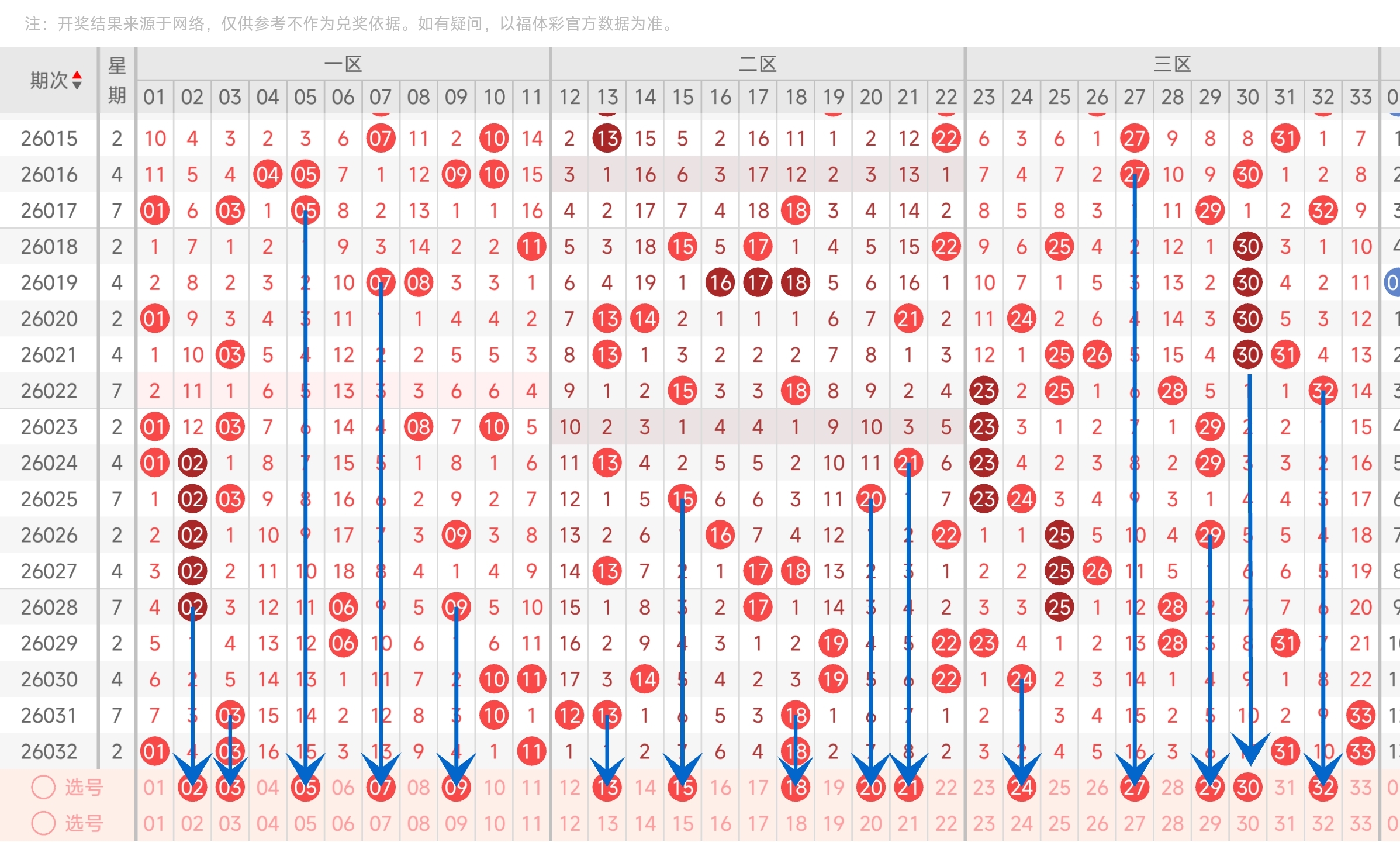 上一期三区开出了31,33号球。往前一期开出了33号球。通过走势图分析,可以看到上期三区开了2码,主要集中在右边,推测本期比较大概率会往中间移动,重点关注中间的号码,然后是左右两边的号码。最后再结合冷热号和遗漏期数,本期我们可以关注24,27,29,30,32等号。综上所述本期我们推测有可能开出24,27,29,30,32等号码。