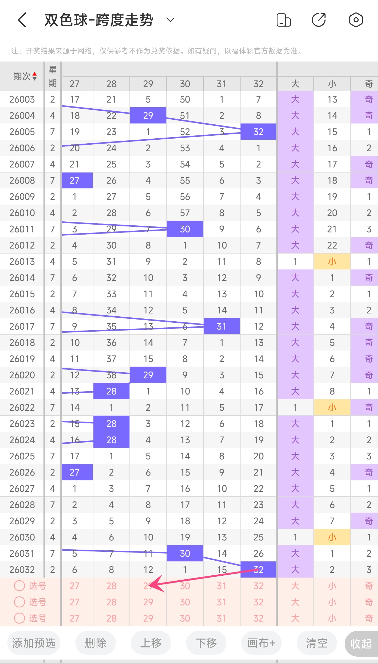 上期龙头为1,凤尾为33,跨度为32,往前一期跨度是30,偏移量为2。32跨度值是30期内开出最大的跨度值。下降的空间很大,上升空间没有了,再根据最近龙头凤尾走势,本期跨度可能会变小,所以推测本期跨度趋势是往左的,跨度变小,小概率保持跨度不变。