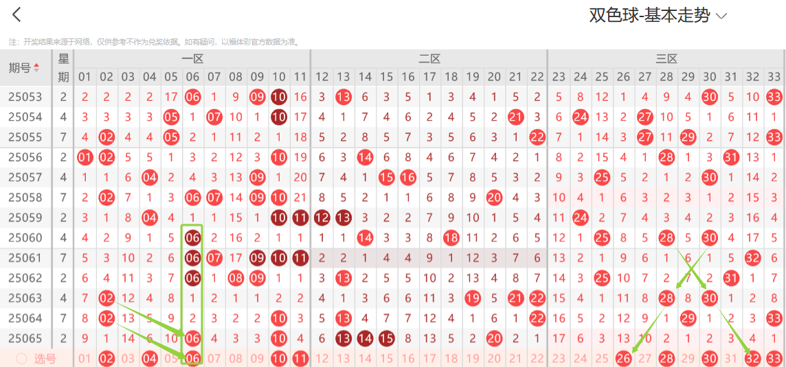 龙头凤尾:上期直播间小车给大家的方向是龙头看一路跟0路,给的条件是第一位+第二位出第三位,同时说明了看三连出号,很早之前就说过,一旦三连开出,很多形态都会发生变化,比如跨度断区等等,我判断一二位单双一致,偶数龙头都正确,其实就是顺势而为,那么本期继续看偶数龙头,看二路跟一路,至于这个6就是走势特别好看,所以特别给大家勾画下,喜欢的大胆用,看2是感觉2尾要回补,看4是有出号需求,看好很多期,那么本期仍然有机会,10这个号真的很热,也是斜连号2.6.10,警惕10.11出三连,形态上,注意第一位第二位单双一致,继续看第一位+第二位出第三位的形态模式,凤尾看二路跟0路,警惕28有出号需求,本期是比较看好三区开出多个号的,走势比较好看的有32其次这个26也很好,上期给大家选了两个追号13.14,我的本意是大家每期根据我的两码追号,然后结合当期的思路来选择,没想到一期就出了,假如用了追号13.14,跟大家说大乐透的号5.10.18.20,不看5.18,那么带上10.20是不是一下就四个红球了,加上车上的6直接5红了,也是大家比较支持,比较给力,所以上期给大家讲了很多干货,包括给了极限杀号,十一码错一个,所以,直播间是会给大家分享很多有用的东西的,只要大家支持,我肯定会告诉大家更多干货,以上对龙头凤尾的分析都是初看,假如与后面的发生冲突,那么以小车其次直播间为主。