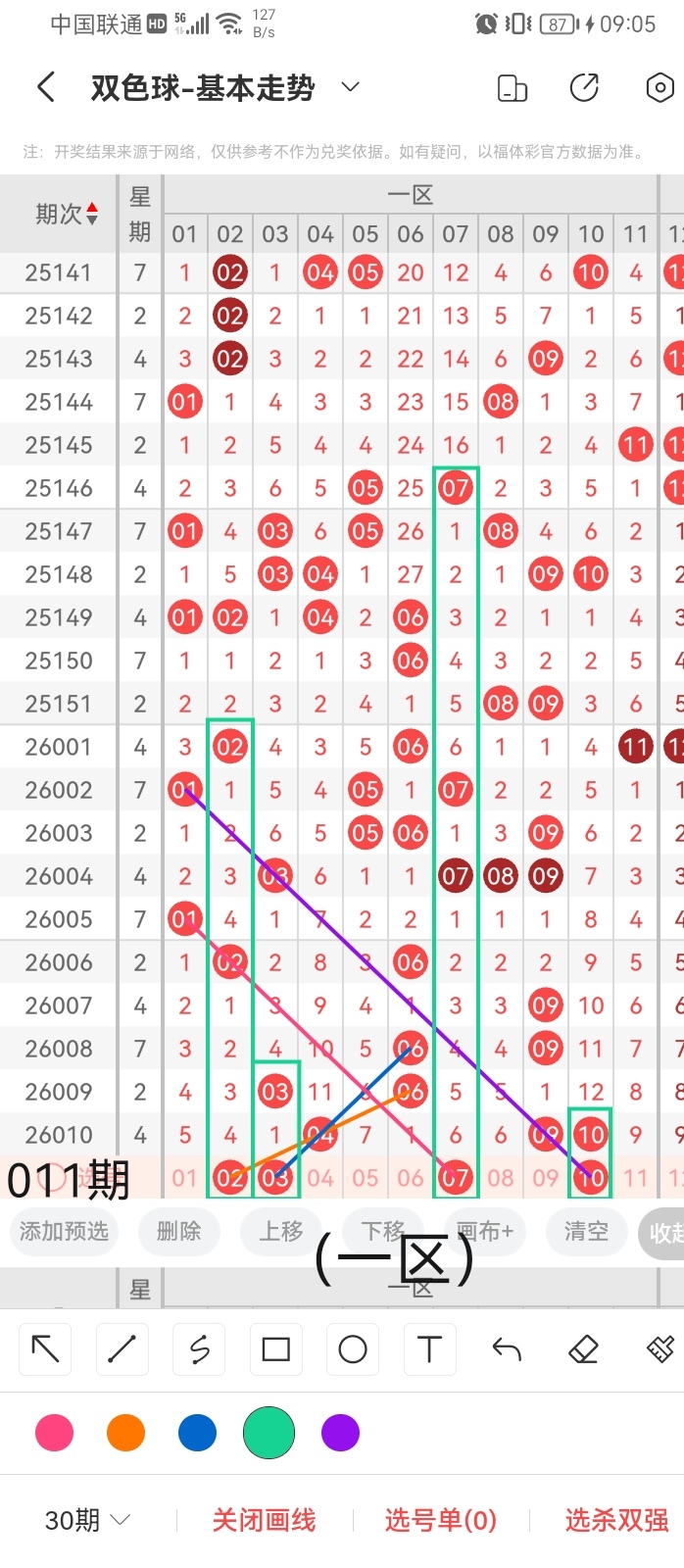 小梁结合上面图中画线思路的论证,最后给大家汇总提供一下本期红球、蓝球数据,供大家参考: