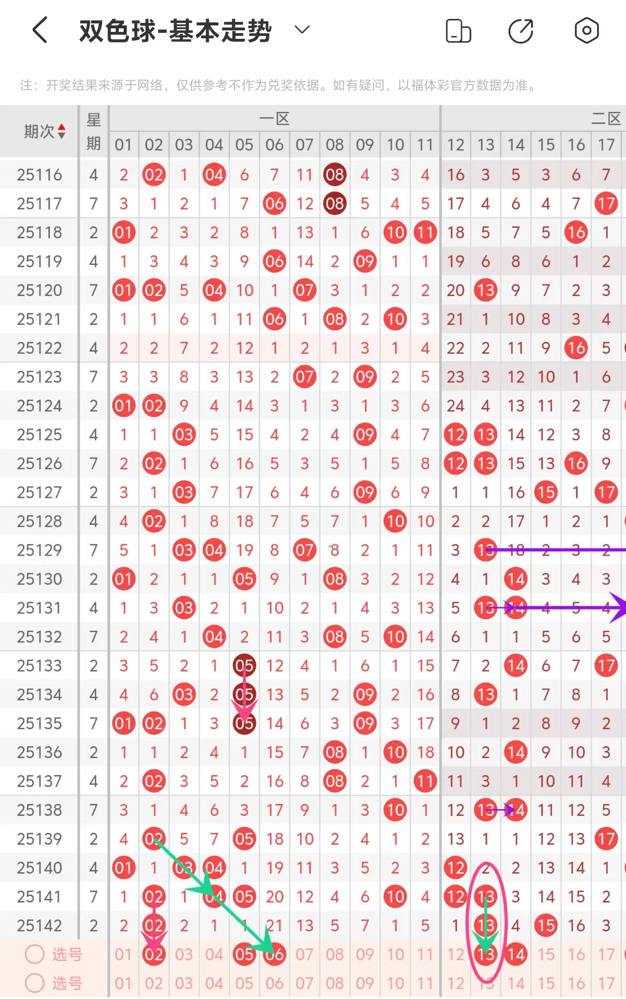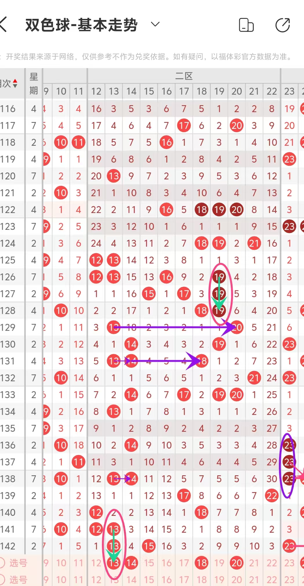 上面红色圆圈19是三连,那么按规律在开了两期13的情况下,有很大机率也是来三连,选13,看紫色箭头,13跟20,18,14一起分别来过,所以在这一期13能出的情况下,选上14,18,20,以配大底的一部分,增加中的概率,接下来看第三区域