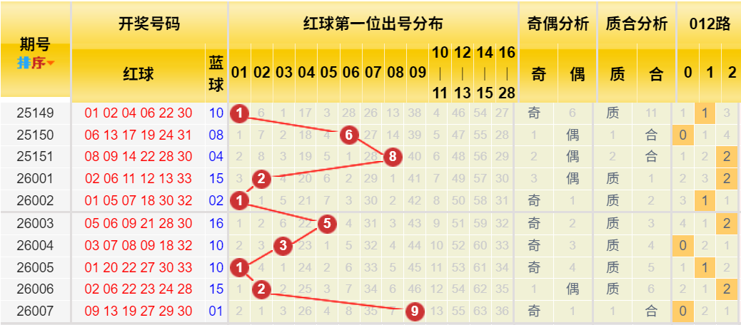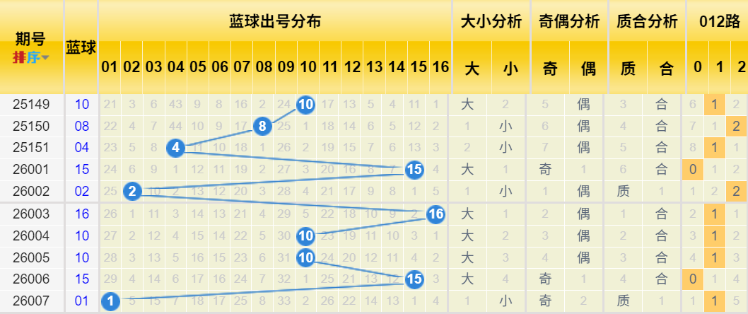 2. 综合判断:历史同期数据中2路号码的略微优势与近期2路的小幅遗漏形成共振。同时,小数蓝球近期占优的趋势明显。因此,本期蓝球可 优先关注2路号码,并侧重在小号中筛选