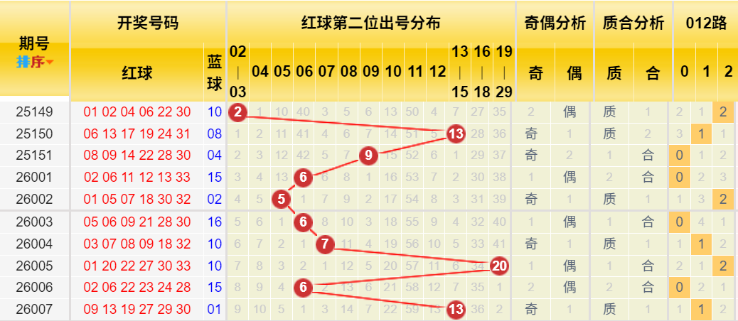 此处出现规律。历史同期第二位号码高度集中在04-13区间(占9/10)。近10期整体数据也支持该区间。上期13处于区间顶端,本期看好落在区间中前部,关注05、07、08