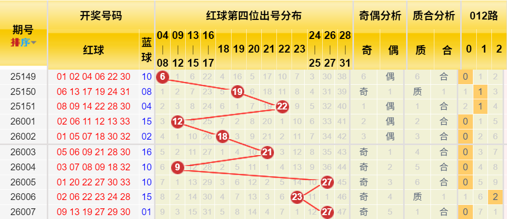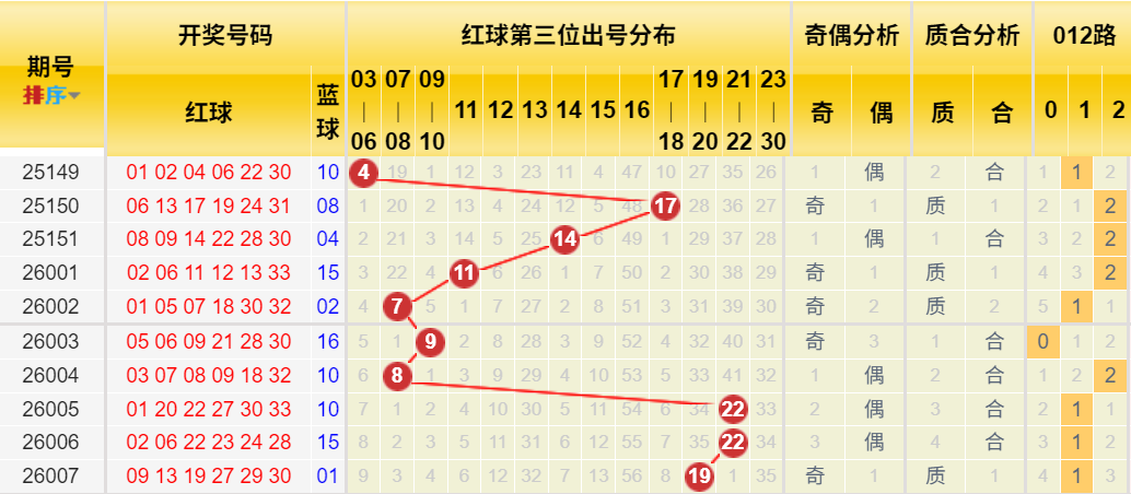 这是另一核心规律点。历史同期数据显示,第四位号码8次落在15-27区间,且集中度较高。上期开出19,符合此规律。本期可能在其附近波动。胆码级关注20、23、25
