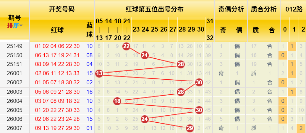 2026007期开奖号码为:09 13 19 27 29 30 + 01。 红球和值127(和尾7),跨度21,奇偶比呈现极端的5:1。蓝球开出1路最小号01。上期奇偶比的严重失衡,是本期的重点调整方向。
