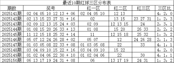 一区上期走温,出现1个奖号,近10期开出25个红球,表现非常活跃,本期预计走温,开出1-2个红球,参考号码10;二区上期表现较热,出现3个奖号,近10期共开出20个红球,出号比例与理论持平,本期预计继续走温,出现1-2个红球,注意号码12、15;三区上期走温,开出2个红球,近10期共开出15个红球,走势相对较冷,本期注意回补,关注3个红球,看好号码24、27、29;
