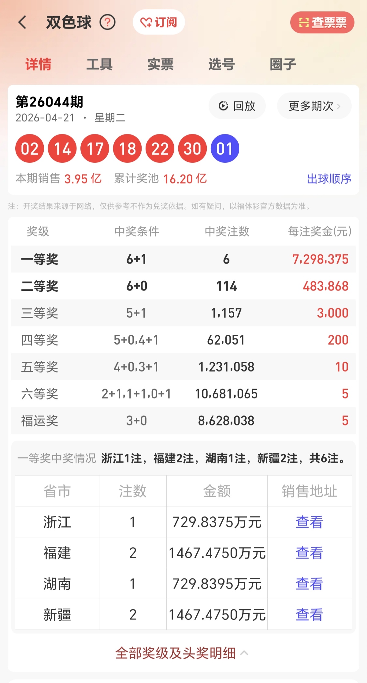 上期044期开奖02 14 17 18 22 30+01,核心特征拉满:偶数扎堆(1:5奇偶比)、二区过热(1:4:1三区比)、和值103中等偏上、跨度28偏大、蓝球01奇数小质数。