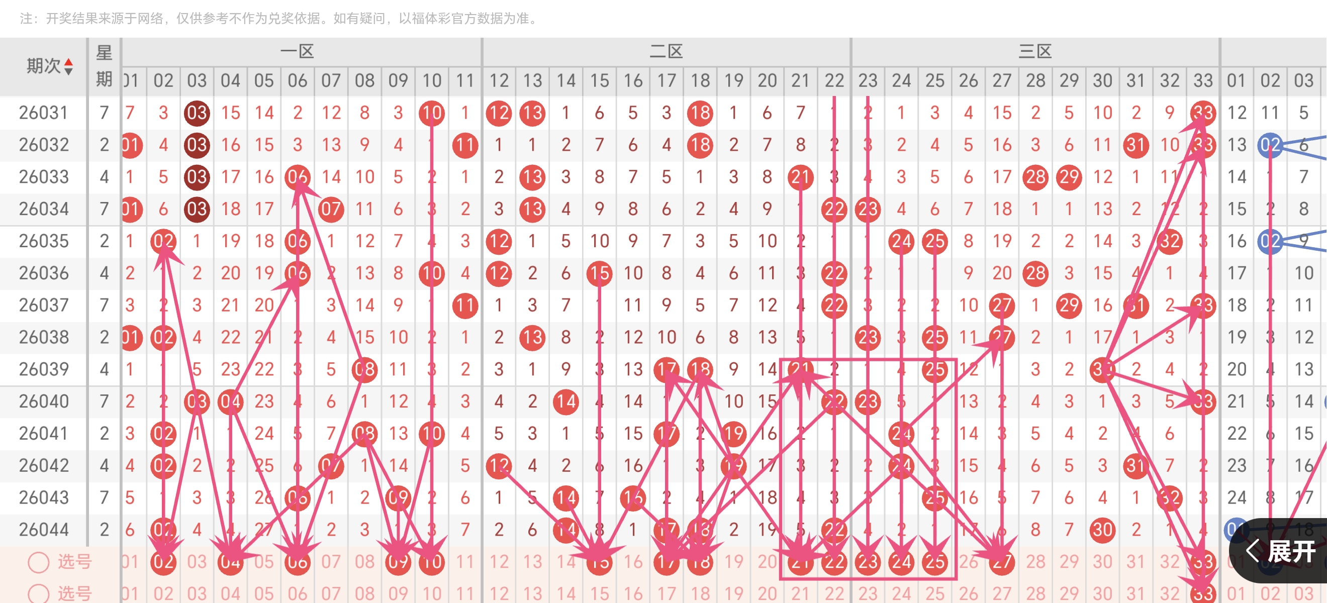 二区上期过热,本期少加量,选15、21(边缘号衔接);三区上期仅30,重点补23、24、25(三连号趋势)、27(冷号),三区凑2-3枚,平衡区间分布。
