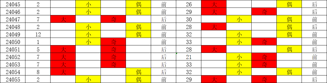 上期开出了1:5的大小比,号码主要分布在前区,根据近10期走势来看,下期大概率会有两种走向,第一种情况是号码两头分布形成3大3小的大小比,第二种情况是大号开始回调形成4大2小的大小比。