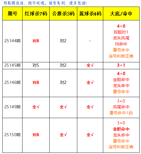 上期红球杀7码对6,公推杀3码全对。蓝球杀4码全对,会员文章中金胆命中,龙头命中,重号命中,连号判断正确。