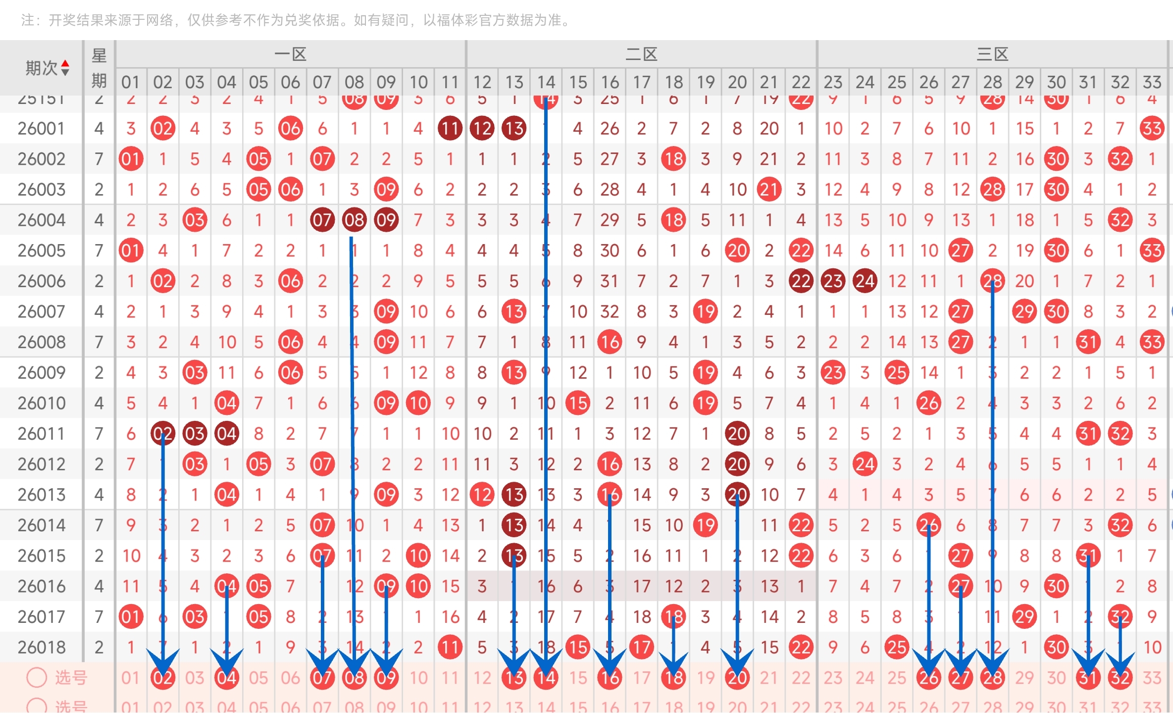 上一期三区开出了2530号球。往前一期开出了2932号球。通过走势图分析,可以看到三区中间的号码是比较热门的,本期可能继续开出,其次右边的号码也比较看好,有可能开出,本期也要关注一下。最后再结合冷热号和遗漏期数,本期我们可以关注2627283132等号。综上所述本期我们推测有可能开出2627283132等号码。