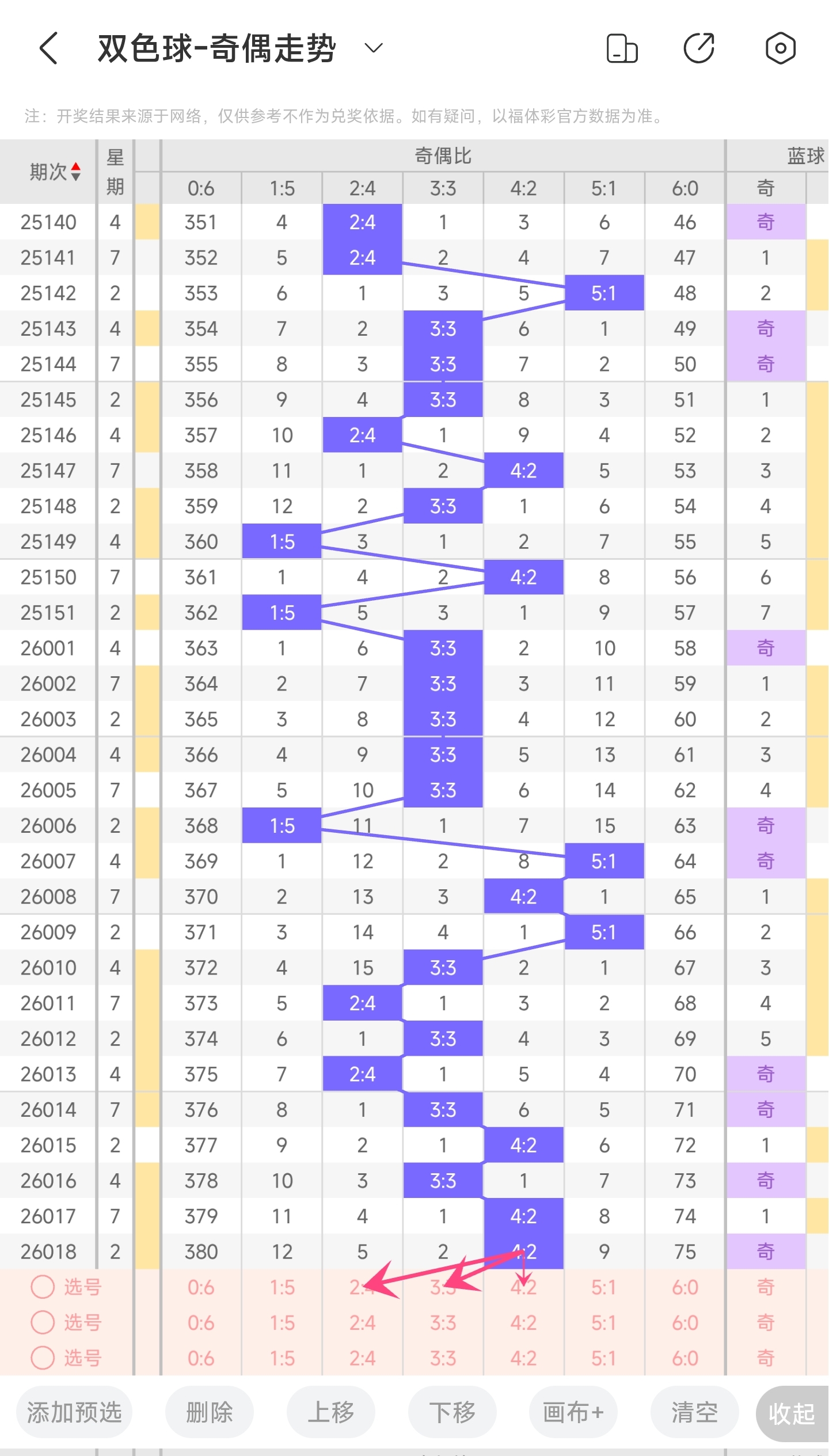 上期奇偶比为4:2,分别为奇奇奇偶奇偶。往前一期奇偶比为4:2。通过近30期内奇偶走势的数据分析,目前1:5奇偶比开出的概率是10%5:1奇偶比开出的概率是10%3:3奇偶比开出的概率是43.33%4:2奇偶比开出的概率是20%2:4奇偶比开出的概率是16.66%6:0奇偶比开出的概率是0%。与前一期相比,4:2概率变大,3:3概率变小。通过分析走势图,上期开了4:2奇偶比,本期比较看好3:3奇偶比,其次是4:2奇偶比和2:4奇偶比。所以本期推测本期可能开3:3奇偶比,其次是4:22:4奇偶比,最后是1:55:1奇偶比。