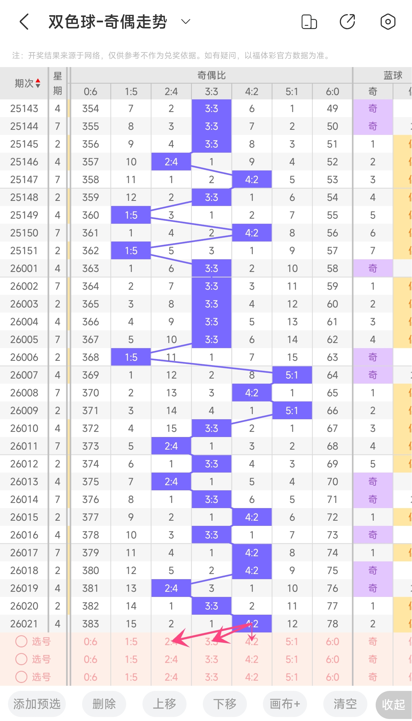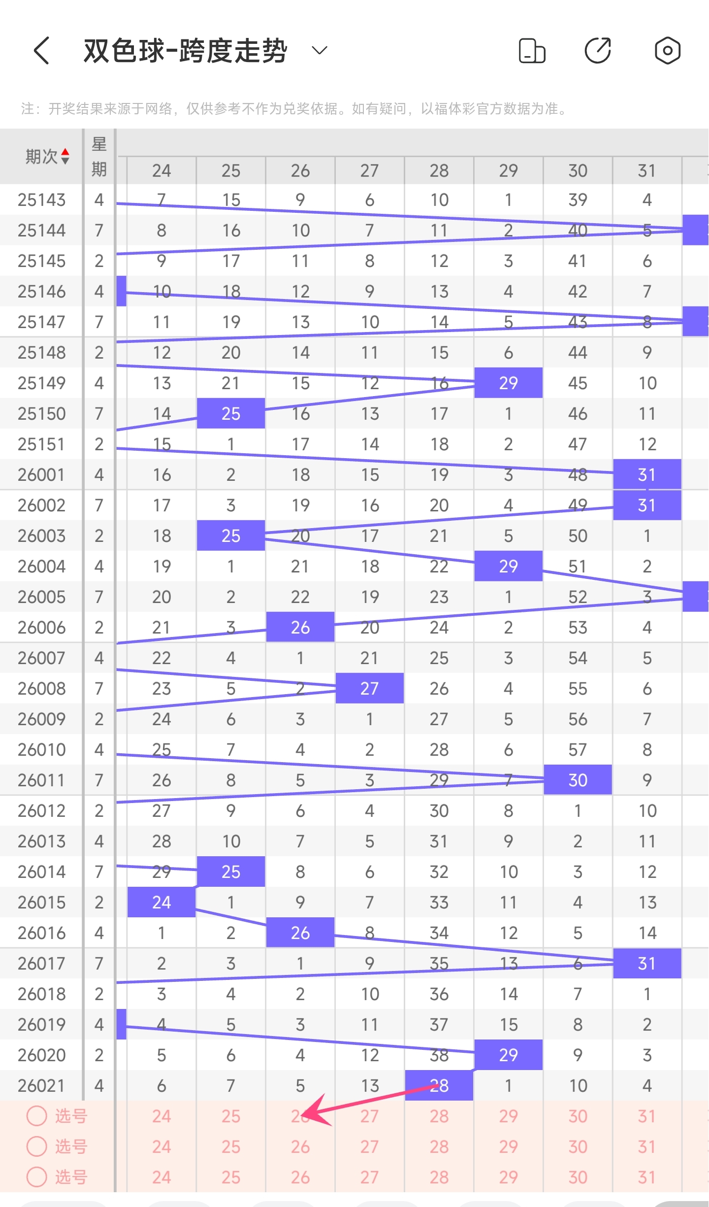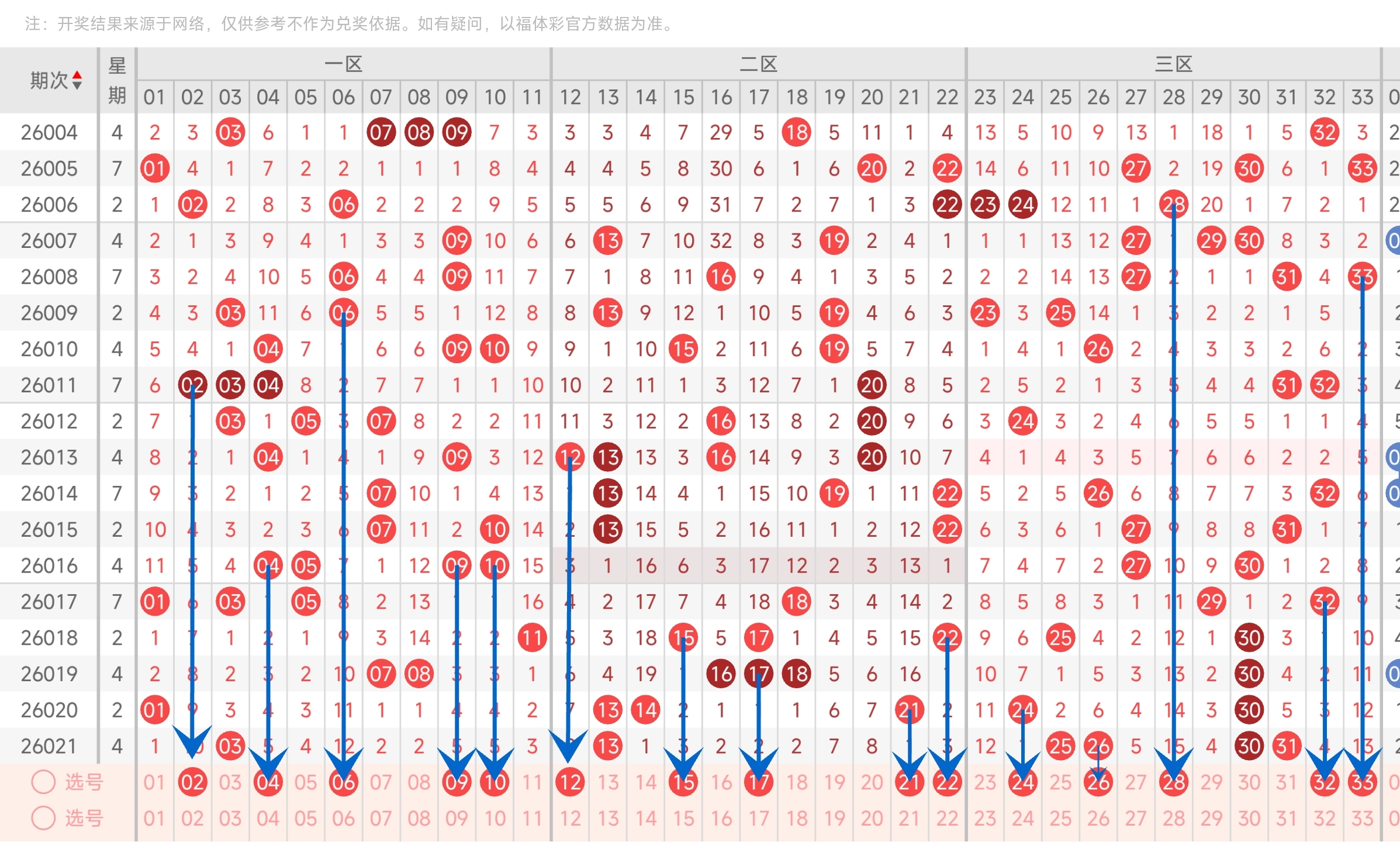上一期三区开出了25263031号球。往前一期开出了2430号球。通过走势图分析,可以看到30连续开了4期,近期凤尾稳定在右边,本期继续关注。然后左边的号码近期有回补趋势,可以注意一下。最后再结合冷热号和遗漏期数,本期我们可以关注2426283233等号。综上所述本期我们推测有可能开出2426283233等号码。