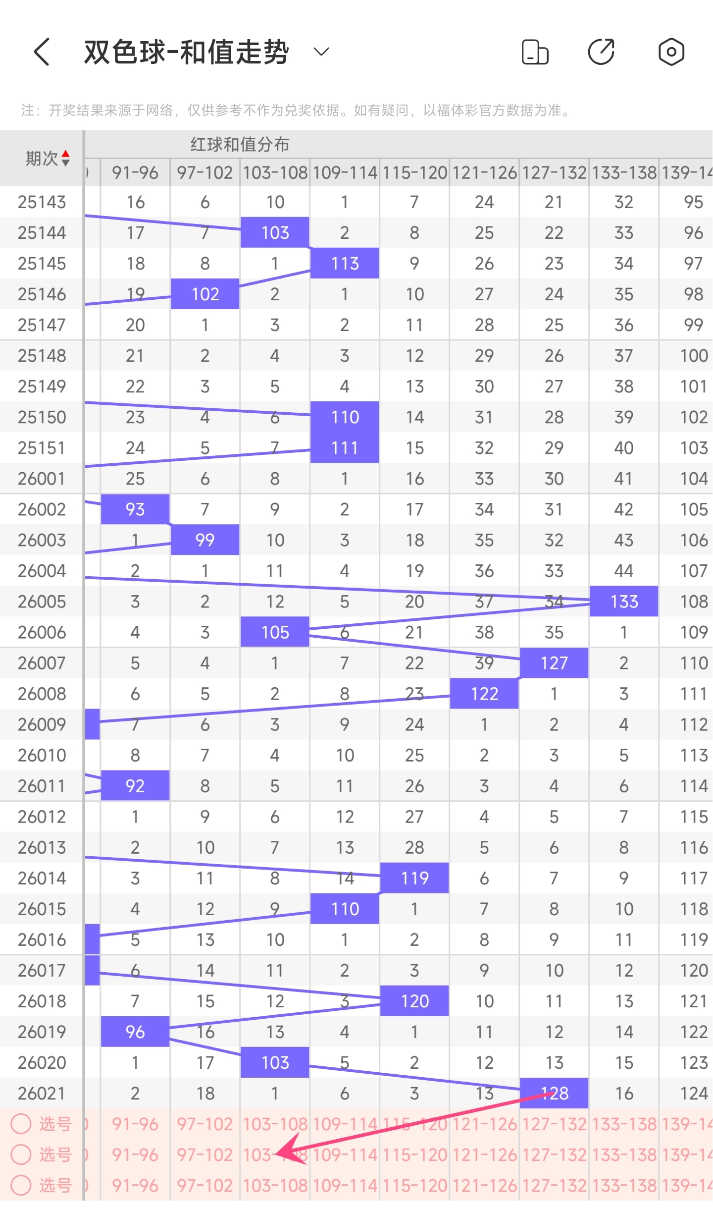 上期龙头为3,凤尾为31,跨度为28,往前一期跨度是29,偏移量为128跨度值是30期内开出比较大的跨度值。上升的空间比较小,下降空间比较大,本期看好跨度变小,所以推测本期跨度趋势是往左的,跨度变小,小概率往右,跨度变大。