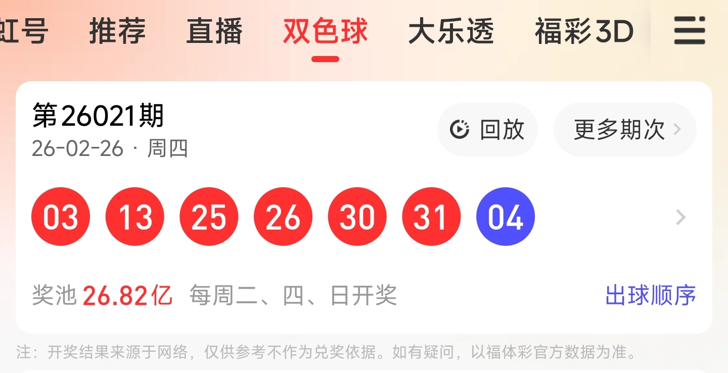 26021期双色球文章中推荐中命中31325314个红球,蓝球命中4